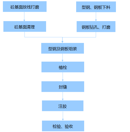 2、當(dāng)工程要求不適用結(jié)構(gòu)粘接劑時(shí),宜選用無(wú)粘接外包型鋼加固法,也稱干式外包鋼加固法。